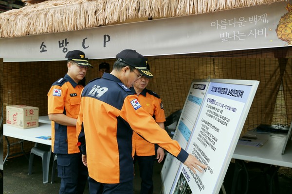 성호선 충남소방본부장이 지난 8일 71회 백제문화제에서 축제장의 안전을 책임지는 직원과 의용소방대원들을 격려하고 소방안전관리 지도를 위해 백제문화단지에 방문했다.