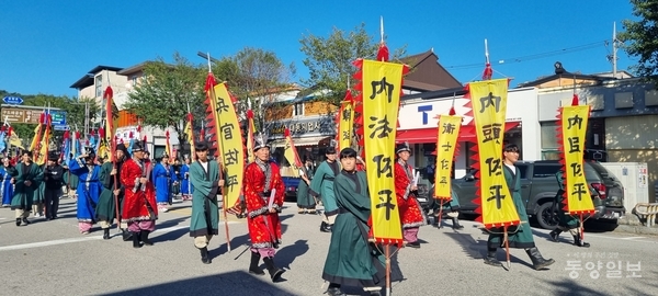 부여군이 71회 백제문화제에서 8년 만에 ‘백제역사문화행렬’을 부활시켜 장엄한 백제 왕도의 위용을 도심 속에서 재현했다.<사진>