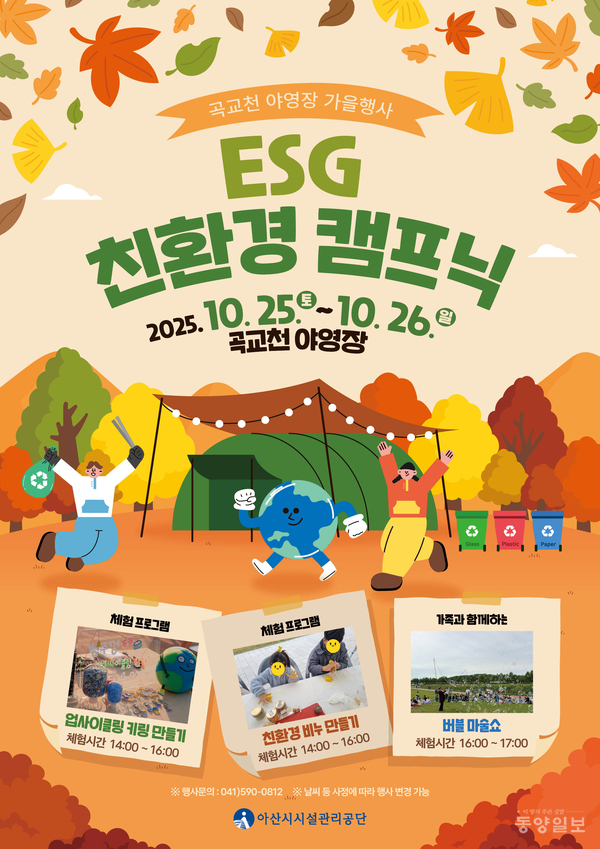 아산시시설관리공단(이사장 김효섭)이 오는 25~26일 곡교천 야영장에서 ‘ESG 친환경 캠프닉’ 행사를 개최한다고 밝혔다.