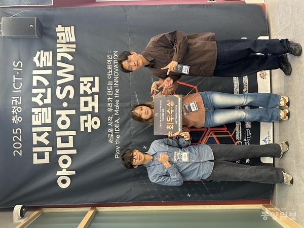 충북대(총장 고창섭)는 컴퓨터공학과 학생팀(이채운·이동건·김상현)이 ‘2025 충청권 ICT·IS 디지털신기술 아이디어·SW개발 공모전’에서 소프트웨어(SW) 개발 부문 최우수상을 수상했다고 13일 밝혔다. 이번 수상은 지난해에 이어 2년 연속 최우수상 수상이다.