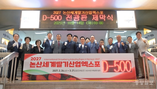 15일 논산시에 따르면 지난 14일 시청 중앙현관에서 '2027 논산세계딸기산업엑스포 D-500 기념 전광판 제막식'을 열고, 국제행사 성공 개최를 향한 본격적인 카운트다운에 돌입했다.