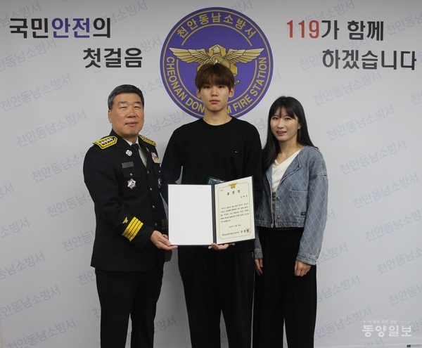충남 천안동남소방서(서장 강종범)는 14일 불이 붙은 차량을 발견하고 신속하게 진화해 피해 확산을 막은 고등학생 김태유(17)군에게 소방서장 표창장을 수여했다.