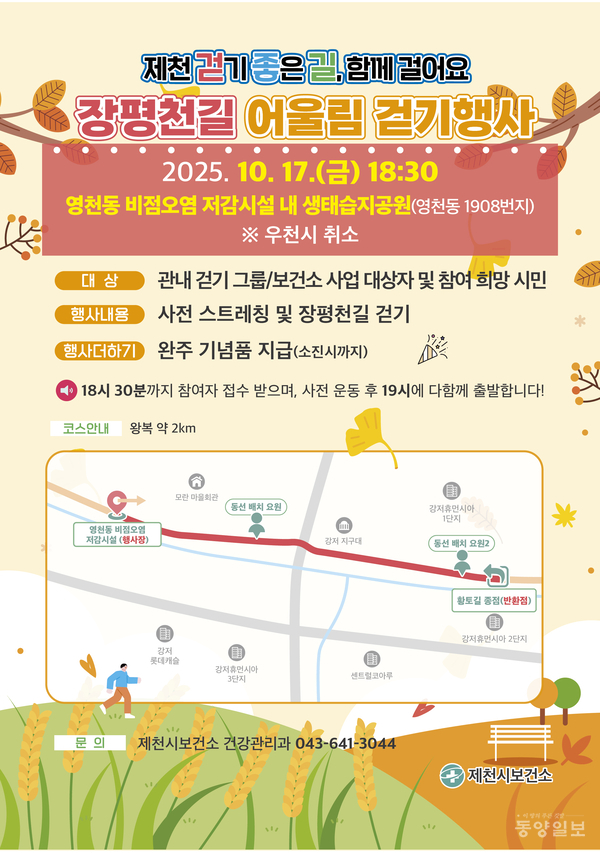 제천시는 오는 17일 걷기 그룹 활성화와 시민 건강 증진을 위한 장평천길 어울림 걷기 행사를 한다.