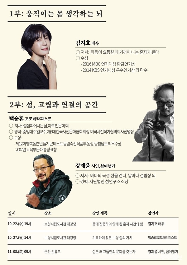 11월에는 강제윤 섬연구소 소장, 오은 시인, 김태훈 팝칼럼니스트, 김탁환 소설가 등이 섬, 독서, 영화를 주제로 강연과 탐방을 이어가며 인문학적 깊이를 더한다.