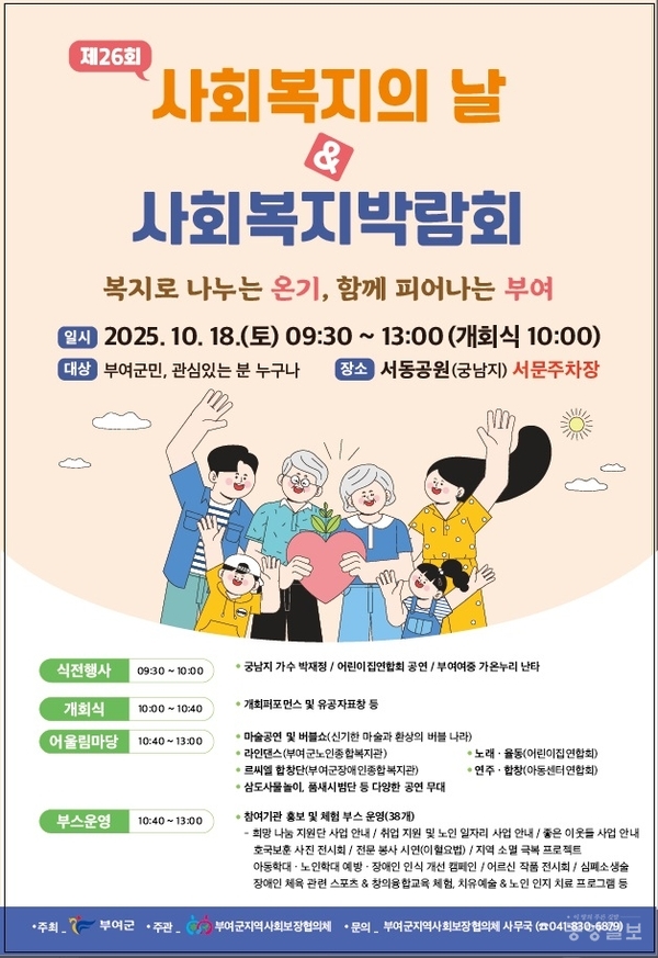 ‘복지로 나누는 온기, 함께 피어나는 부여’라는 주제로 진행되는 행사에서는 △사회복지 유공자 표창 △슬로건 공모 시상 △희망 손수건 휘날리기 퍼포먼스 등이 펼쳐지며, 어울림마당에서는 지역아동센터와 어린이집 등에서 준비한 다채로운 공연이 무대를 채운다.