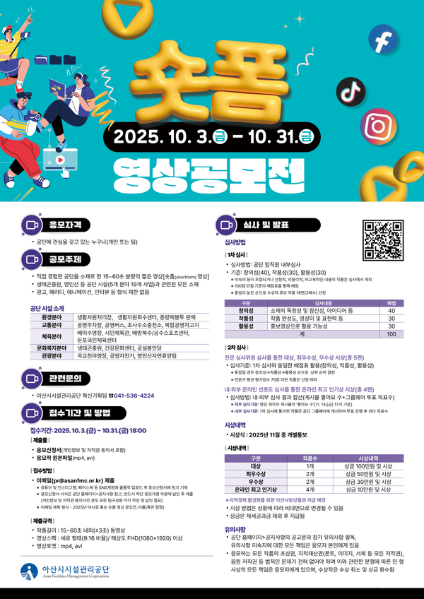 아산시시설관리공단이 오는 31일 까지 ‘2025 아시공 홍보 숏폼 영상 공모전’ 신청을 받는다.