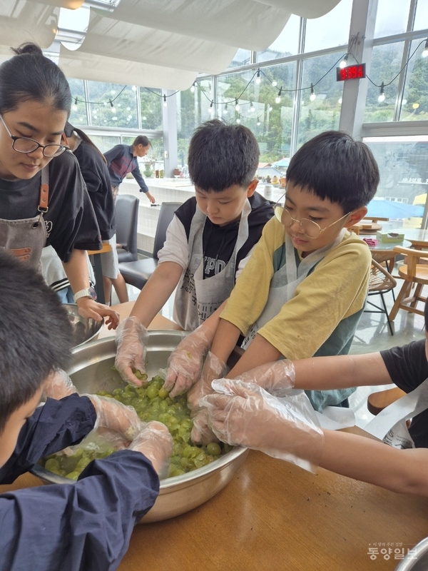영동 심천초(교장 정윤옥)가 학생들이 지역의 자원을 이해하고 지역에서 찾을 수 있는 다양한 직업 세계를 경험하기 위해 17일 전교생이 지역의 대표 특산물인 포도를 활용한 포도주 담그기 체험학습을 진행했다.