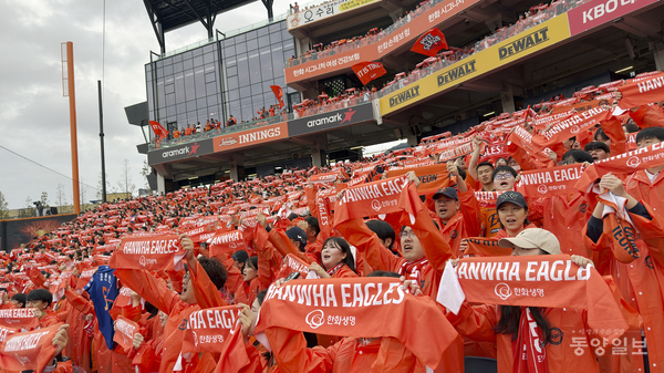 한화이글스와 삼성라이온즈의 2025 KBO 프로야구 포스트시즌 플레이오프 2차전이 19일 대전 한화생명볼파크에서 열렸다. 한화이글스의 상징인 오렌지색 응원용품을 착용한 한화팬들이 응원을 펼치고 있다. 한준성 기자 qwer@dynews.co.kr