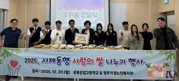 충북공고는 20일 가경노인복지회관을 방문해청원쌀 대청호 마라톤 대화 기념품으로 받은 쌀 160kg을 전달했다. 충북도교육청