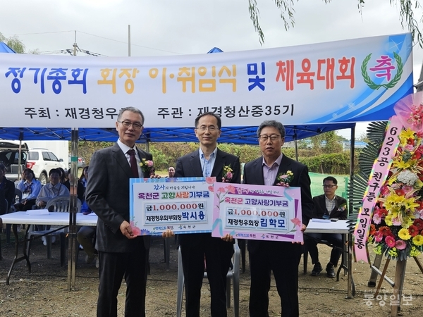 옥천군에 따르면 19일 인천광역시에서 열린 62주년 재경청우회 정기총회와 체육대회에서 김 회장과 박 부회장이 옥천군에 각각 100만 원을 쾌척했다.