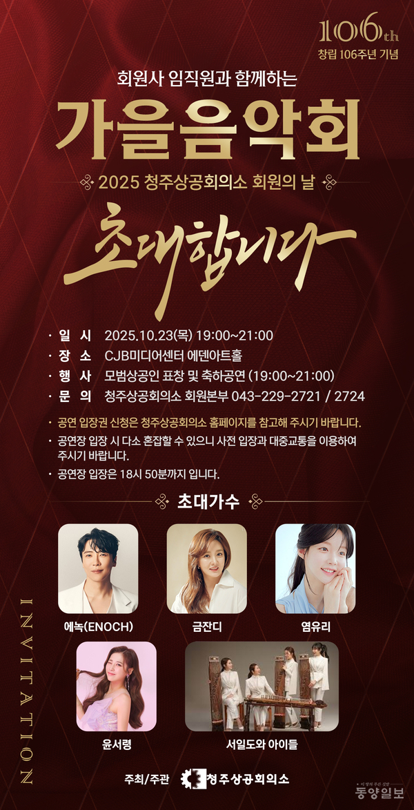 청주상공회의소(회장 차태환)는 오는 23일 오후 7시 CJB미디어센터에서 회원사 대표와 임직원을 대상으로 '2025 청주상공회의소 회원의 날-회원사 임직원과 함께하는 가을음악회' 행사를 연다고 20일 밝혔다.