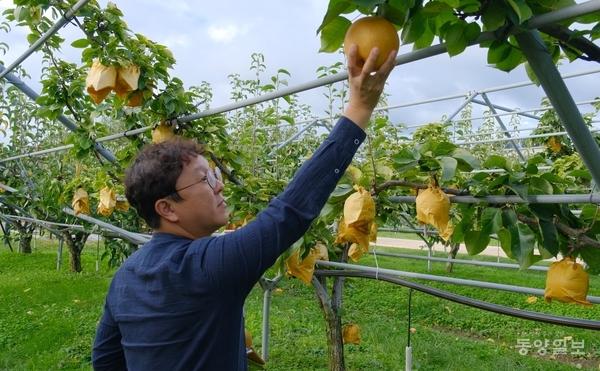 충북 영동군 영동읍 매천리 과일나라테마공원에서 수령 100년이 넘는 배나무들이 올해도 어김없이 황금빛 열매를 맺었다.