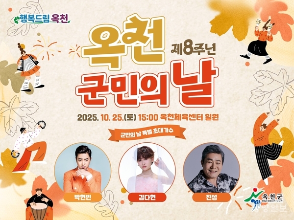 군민과 출향인 그리고 명예 옥천군민 등이 함께하는 소통의 장으로 축하영상, 군민대상 시상, 명예군민 증서 수여 등이 진행되며 초대가수 트롯요정 김다현과 안동역에서 진성 그리고 샤방샤방으로 널리 알려진 박현빈이 축하공연으로 기념행사를 뜨겁게 달굴 예정이다.