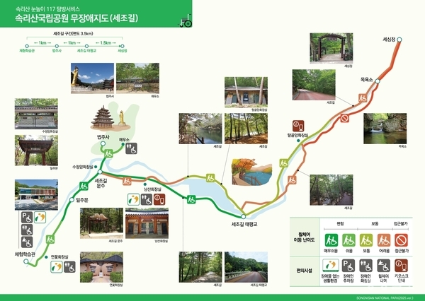 휠체어 이용객의 평균 눈높이가 117㎝인 점에 착안해 ‘117 탐방서비스 지도’라고 이름 붙인 무장애 탐방지도는 체험학습관∼일주문∼법주사 구간과 세조길 문주∼태평교∼목욕소∼세심정 구간이 무장애 탐방로로 구성했다.