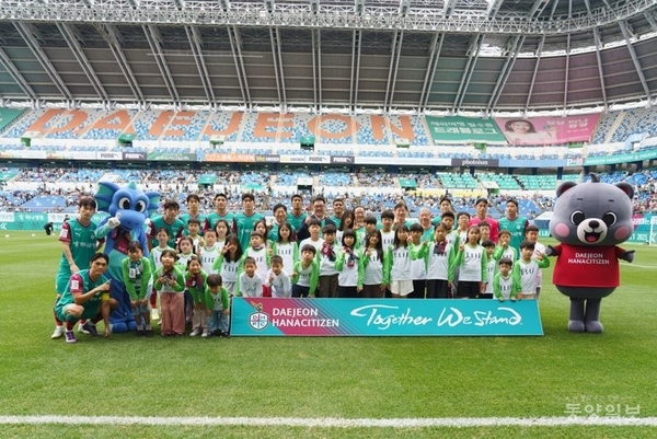 특히 이날 경기에서는 계룡건설 임직원 자녀 32명이 대전하나시티즌 선수들과 함께 에스코트 키즈로 입장해 계룡가족에게 특별한 추억을 선사했다.