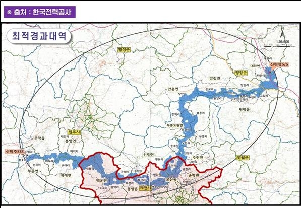 한전은 앞서 송전선이 통과하기에 적합한 지역(최적경과대역)으로 제천시 봉양읍·백운면·송학면·모산동의 16개 마을을 포함했다.