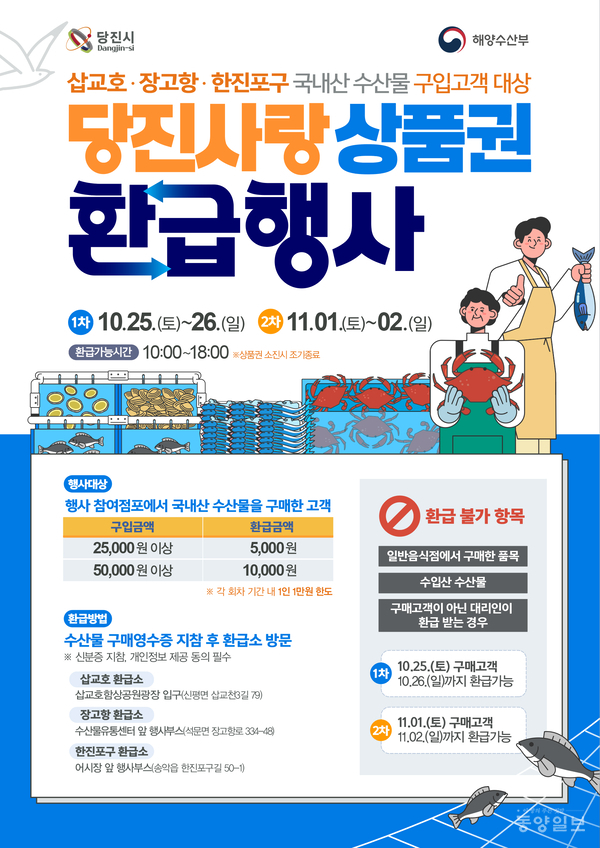 당진시(시장 오성환)는 가을철을 맞아 25~26일 이틀간 국내산 수산물을 구매한 고객에게 최대 20%를 당진사랑상품권으로 환급하는 행사를 진행한다고 22일 밝혔다.<사진>
