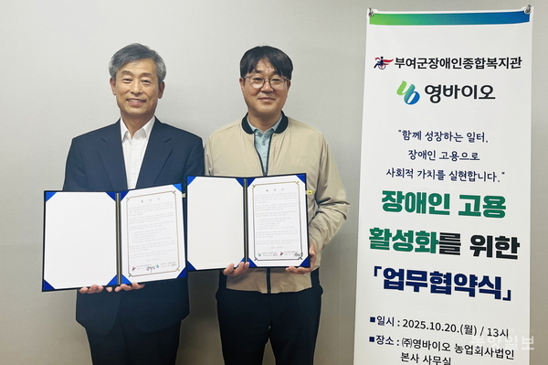 ㈜영바이오는 지난 20일 부여군장애인종합복지관과 장애인 일자리 창출과 복지 증진을 위한 업무협약을 체결하고, 후원금 300만원을 전달했다. <사진>
