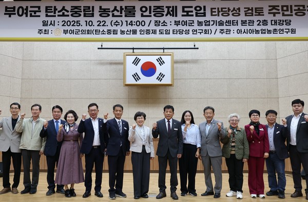 부여군의회(의장 김영춘)는 22일 부여군농업기술센터 대강당에서 ‘탄소중립 농산물 인증제 도입 타당성 검토’를 주제로 주민공청회를 열었다.