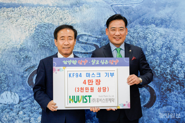 ㈜휴비스트제약 박광남 대표는 단양군청을 방문해 김문근(왼쪽) 단양군수에게 감염병 확산 예방과 지역사회 안전을 위해 단양군에 KF94 마스크 4만장(3000만원 상당)을 기부했다. 이번 기부는 계절성 호흡기 감염병이 증가하고 겨울철 감염병 확산 우려가 커지는 가운데 지역 주민의 건강 보호와 예방 활동을 지원하기 위한 취지로 마련됐다.