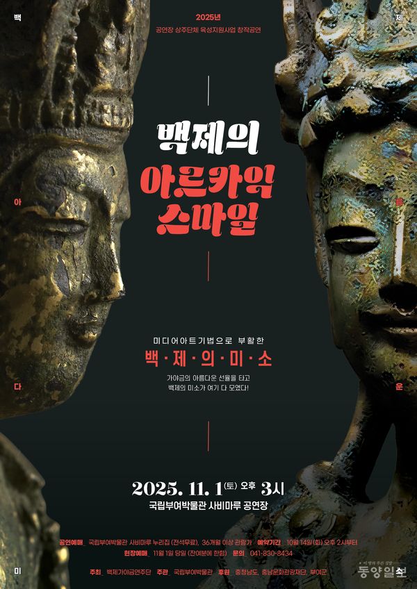 2025년 공연장 상주단체 육성지원사업 창작공연 ‘백제의 아르카익 스마일–백제의 미소’ 공연이 오는 11월 1일 오후 3시, 국립부여박물관 사비마루 공연장에서 개최된다. 이번 공연은 백제가야금연주단이 주최하고, 국립부여박물관이 주관하며, 충청남도·충남문화관광재단·부여군이 후원한다.