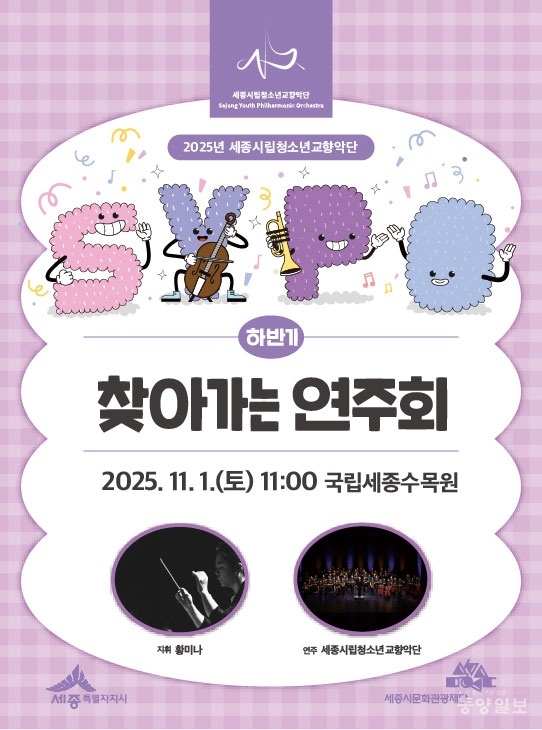 세종시립청소년교향악단(단장 최민호)이 내달 1일 오전 11시 국립세종수목원에서 올해 마지막 ‘찾아가는 연주회’를 한다.
