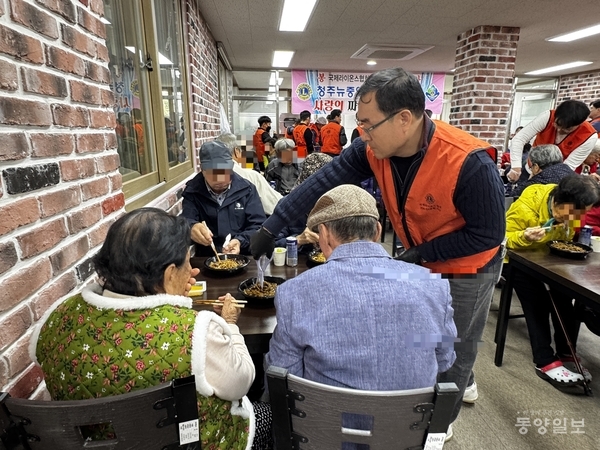 청주뉴중앙라이온스클럽(회장 박태범)은 27일 용암종합사회복지관(관장 채근숙) 경로식당 노인들을 위해 짜장면 120그릇을 후원하며 따뜻한 나눔의 시간을 가졌다.
