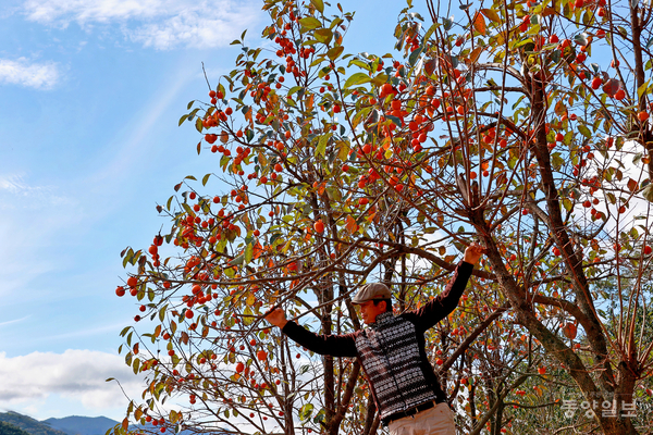 큰 일교차에도 불구하고 가을 햇살이 누리에 퍼지는 28일 괴산군 연풍면 감밭에는 주홍빛 색깔들이 결실의 의미를 더해 주고 있다.
