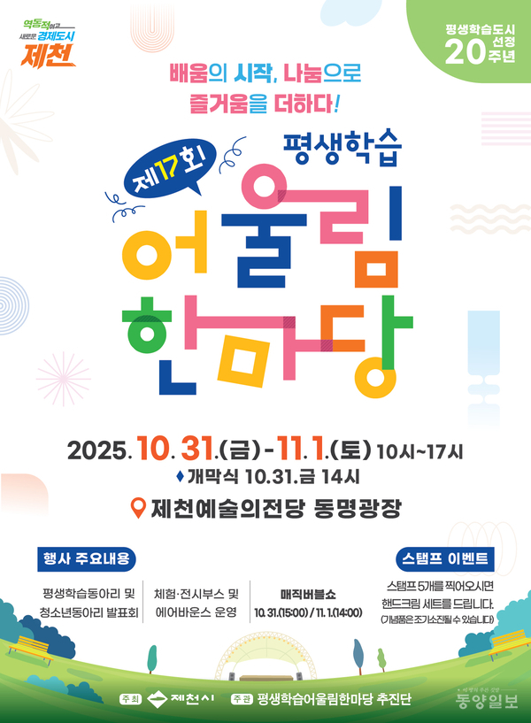 제천시는 시민 모두가 함께 배우고 성장하는 평생학습문화 확산을 위해 17회 ‘평생학습 어울림한마당’ 행사를 10월 31일~11월 1일 제천 동명광장 일원에서 한다.