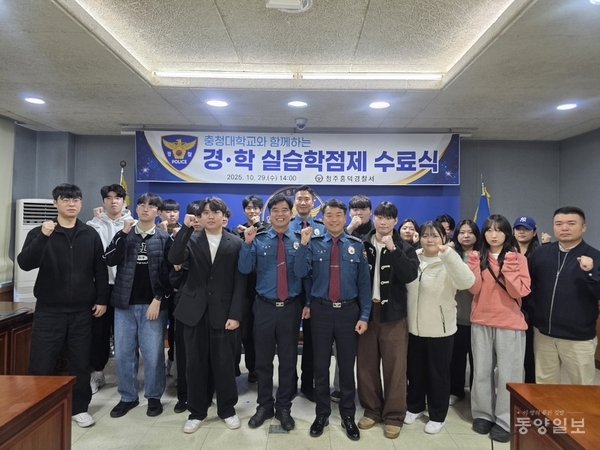 학생들은 지난 11~29일 5주간 청주흥덕서 지역경찰관서와 중앙경찰학교, 대전국립과학수사연구소 등을 견학했다. 또 범죄취약지 합동순찰, 사격체험 등 다양한 경찰 업무를 직접 체험하며 실무 능력을 쌓았다.