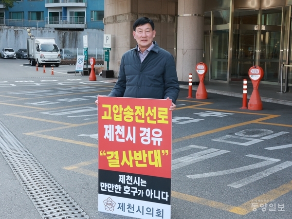 박영기 제천시의회 의장도 이날 산업통상자원부와 한국전력공사가 추진 중인 ‘신평창~신원주 송전선로 건설사업’ 입지선정 위원회 회의장 앞에서 ‘송전선로 제천경유 결사반대’ 1인 시위에 나서는 등 사업 백지화를 요구했다. 제천 장승주 기자 ppm6455@dynews.co.kr