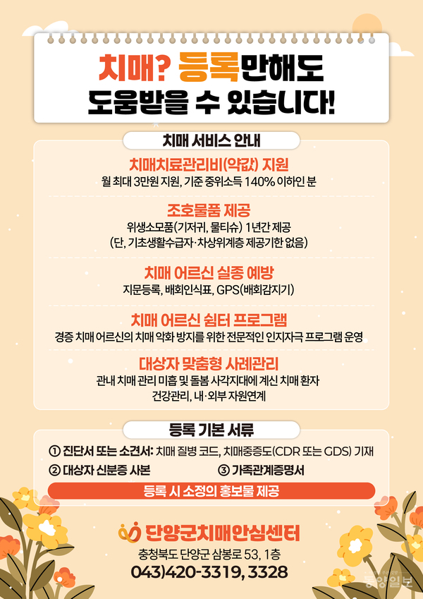 단양군 치매안심센터는 치매환자와 가족의 삶의 질을 높이고 조기 지원 체계를 강화하기 위해 치매환자 등록을 독려하고 있다.