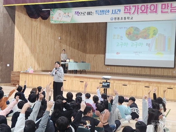 영동초(교장 강창석)가 29일 본교 강당에서 4학년 학생 91명을 대상으로 그림책 작가 전해숙과 함께하는‘작가와의 만남’행사를 가졌다.