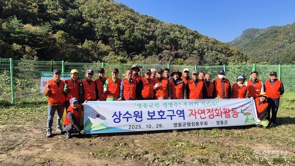 충북 영동군행정동우회(회장 이석균)는 29일 상수원 보호구역 자연정화 활동을 하며 ‘깨끗한 영동 만들기’를 실천했다.