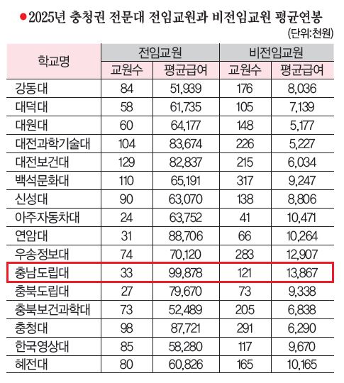 폴리텍대를 제외한 충청권의 16개 전문대의 올해 전임교원의 평균연봉은 7087만원이다. 비전임교원은 817만원에 불과해 비전임교원이 전임교원에 비해 8배 이상 차이가 나는 등 심각한 불균형을 가져오고 있다.