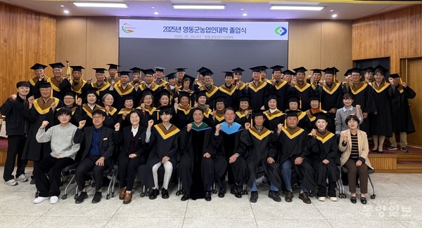 영동군이 전문 농업분야에 대한 이해와 기술을 체계화해 지식기반사회에 적합한 전문농업경영인 육성을 목표로 블루베리학과, 스마트정보학과, 와인학과를 운영한 농업인대학 졸업식이 30일 졸업생 59명이 참석한 가운데 열렸다.