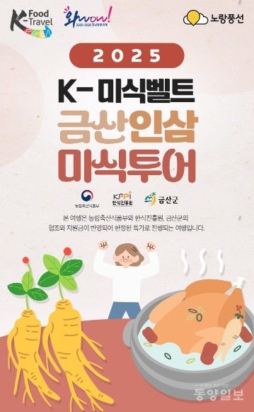 상품을 예약한 고객에게 선착순으로 심마니 망태기 제공 및 레시피 엽서 투어 프로그램도 진행한다. 참여 가격은 정부·지자체 지원금을 반영해 1인당 6만8000원으로 오는 30일까지 한정 운영된다. 투어 참여 예약은 노랑풍선 공식 홈페이지 내 금산미식벨트기획전 페이지에서 할 수 있다.