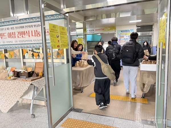 옥천중(교장 김수정)이 3일 학생의 날을 맞아 본관 현관에서 ‘아침밥 나눔 행사’를 가졌다.