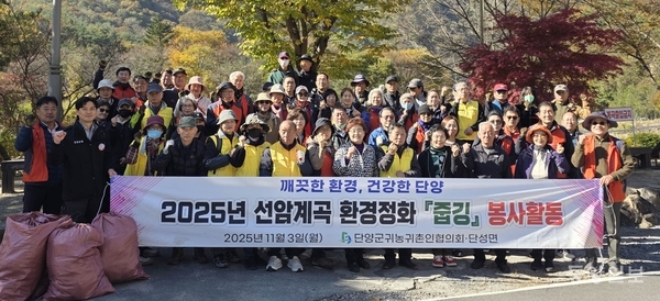 단양군 귀농·귀촌인협의회(회장 박영자) 70여명의 회원들은 지난 3일 단성면 소선암오토캠핑장에서 소선암자연휴양림까지 약 2km 구간에서 2025년 ‘선암계곡 환경정화 줍깅 봉사활동’을 했다. 환경정화 활동 후에는 선암골 생태 유람길을 함께 걸으며 단양의 가을 정취를 만끽하고 회원 간 소통과 화합을 도모하는 시간도 가졌다.