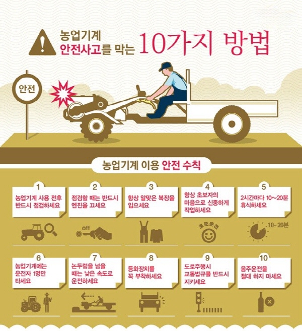 농기계 안전사고는 9~11월 수확기에 특히 잦고 운전 중 부주의와 교통법규 위반, 음주 운전, 정비 소홀과 조작 미숙 등이 주요 원인으로 지적되며 보호장구 미착용, 야간 작업 시 시야 확보 미흡도 위험을 높이는 요소다.