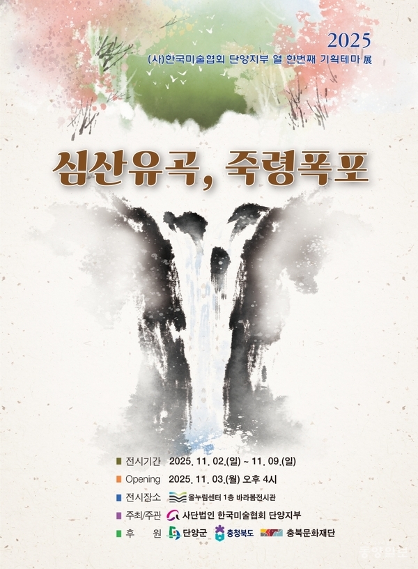 한국미술협회 단양지부가 단양의 자연과 예술의 조화를 주제로 한 기획테마전 ‘심산유곡-죽령폭포’를 오는 9일까지 개최한다.