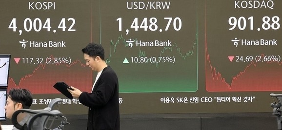 코스피는 이날 전장보다 117.32포인트(2.85%) 내린 4004.42로 장을 마쳤다.