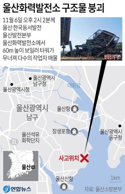 울산 남부소방서의 사고 현장 1차 브리핑에 따르면 이 발전소 내에는 쌍둥이처럼 똑같이 생긴 높이 60m짜리 보일러 타워 4·5·6호기가 나란히 서 있는데, 그중 가운데 있던 5호기가 이날 오후 2시 2분께 무너졌다.