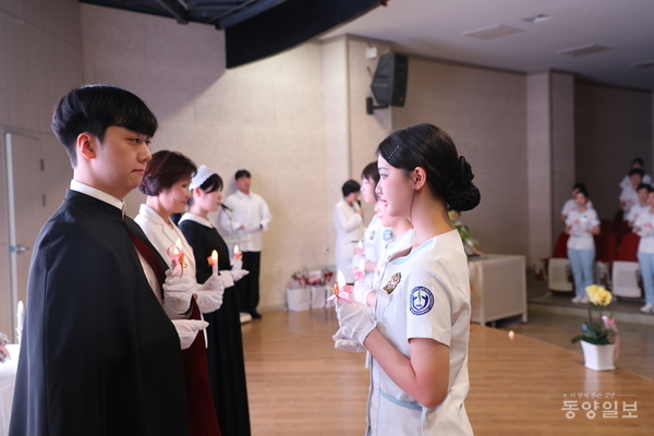 충북보건과학대 간호대학은 6일 미네르바홀에서 128명의 학생들이 참여해 ‘14회 나이팅게일 선서식’을 열고 간호전문직으로 나아갈 학생들의 첫 걸음을 축복했다. 학생들은 나이팅게일의 숭고한 정신을 이어받아 간호전문직에 헌신할 것을 다짐했다. 충북보과대