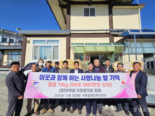 부여읍이장단(회장 이광열)이 지역 내 어려운 이웃을 위해 직접 재배한 ‘사랑 나눔 쌀’ 288포(10kg, 880만원 상당)를 부여읍행정복지센터에 기탁하며 지역사회에 훈훈한 감동을 전했다.<사진>