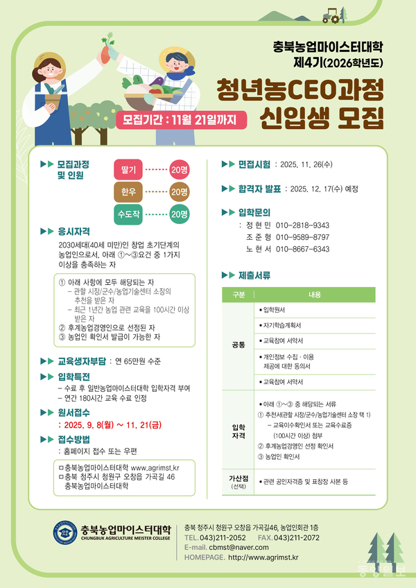자세한 사항은 충북농업마이스터대(☎043-211-2052)로 문의하면 된다. 김민환 기자 kgb5265@dynews.co.kr