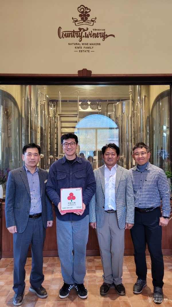 영동군 영동읍 지역사회보장협의체(민간위원장 김민수)가 10일 영동읍에 위치한 컨츄리와이너리 (대표 김덕현)를 착한가게로 지정하고 현판을 전달했다.