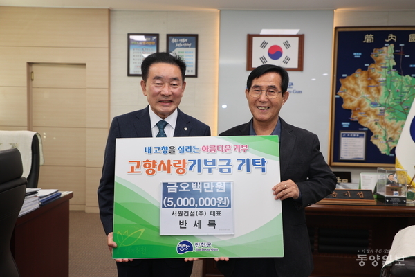 진천군 서원건설(주) 반세록 대표는 10일 진천군청을 방문해 고향 사랑 기부금 500만원을 전달했다.