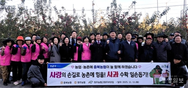 농협충북본부(총괄본부장 이용선)와 청주농협(조합장 이화준)은 11일 '농업인의 날'을 맞아 청주 청원구 사과농장에서 수확기 일손돕기에 나섰다.
