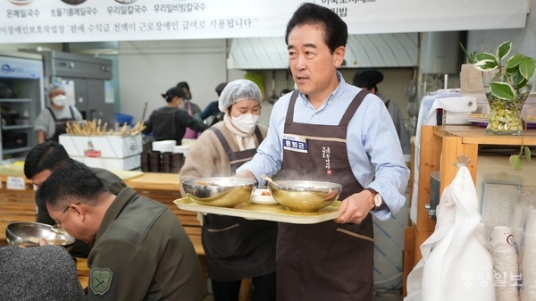 이날 윤 전 청장은 손님들을 직접 맞이하고 잔치국수, 어묵국수, 비빔국수 등 다양한 메뉴를 서빙하며 활기찬 분위기를 이끌었다. 그의 참여 덕분인지 식당에는 300여명의 손님이 몰려 문전성시를 이뤘다.